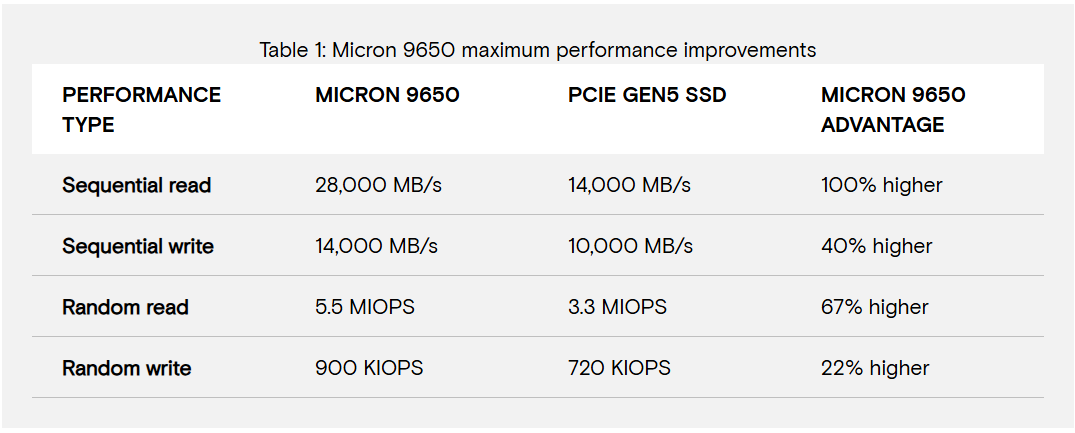 Overall, according to Micron’s numbers, its new 9650 is 40% faster in write speeds than PCIe Gen 5 SSDs, 67% faster in random read speeds, and 22% faster in random write speeds. Take this info with a pinch of salt, as Micron did not share the exact PCIe 5.0 SSD model it is referring to, but most outgoing PCIe 5.0 SSD write speeds sit around the 10GB/s to 13GB/s range.